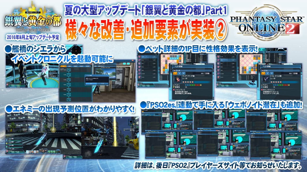 細かい変更点だが艦橋からイベントクロニクルが閲覧可能となり、インターフェイス周りの改善としてペットの性格が1ページ目に表示されたり、東京等のエネミー出現予測の表示がより見やすく改善される。ウェポノイド潜在も多く追加されるが小さくて見えない上に正直、あまり期待はできない。
